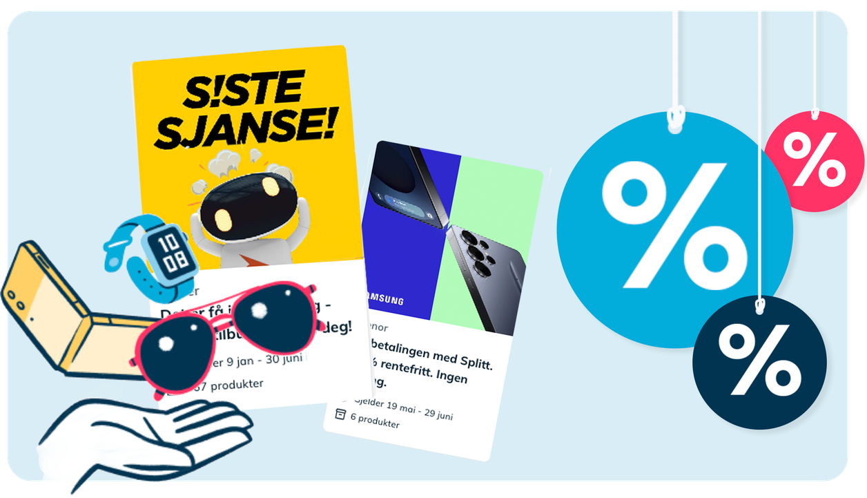3 for 2, cashback eller en sykkel gratis? Hos oss finner du aktuelle kampanjer og rabatter som kan gi deg mer for pengene. Kampanjene kommer fra butikker og merkevarer som er betalende kunder hos Prisjakt.