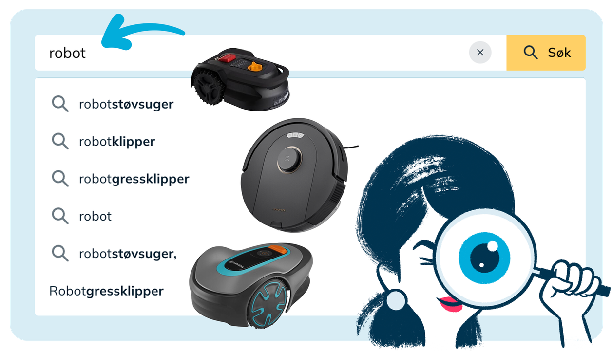 ✔︎ Viser det viktigste. Søkefunksjonen er lynrask og enkel å bruke både på datamaskin og mobil. Skriv inn et søkeord, så viser vi relevante og populære treff med bilde, produktnavn og pris. Enkelt og uten unødvendig informasjon.
