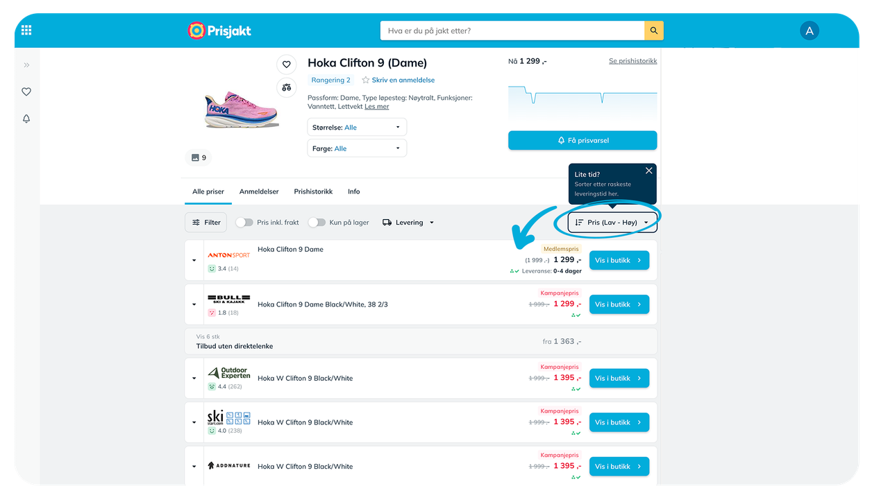 Når du klikker på et produkt, får du opp en liste over alle prisene vi har funnet. I utgangspunktet er den alltid sortert slik at den laveste prisen vises først, men du kan velge å sortere og filtrere listen på andre måter for å finne det tilbudet som passer deg best. Pris er ikke alltid alt!