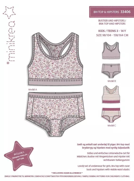 MiniKrea Snittmønster 33406 BH Topp og Hipsters Str. 3-14 år