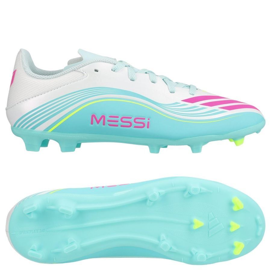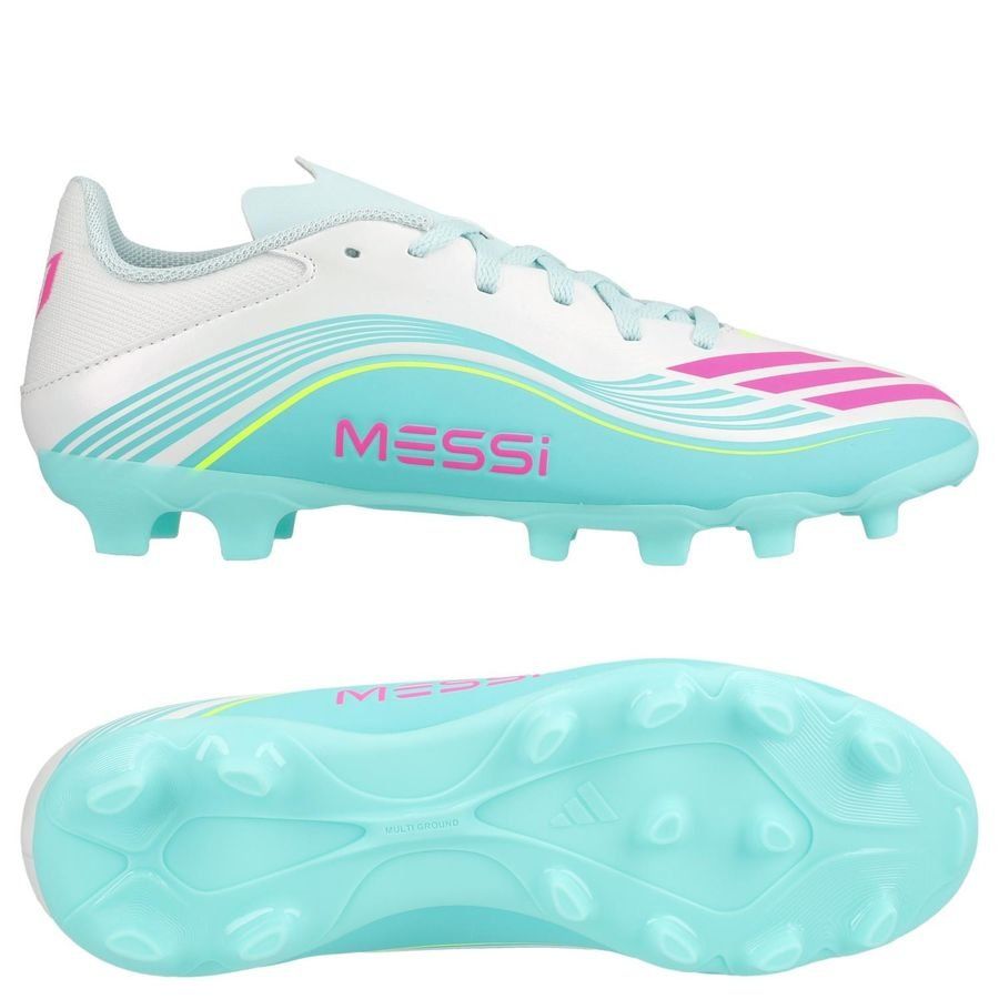 adidas F50 Messi League MG Aurora Radiante - Fottøy Hvit/Lucid Pink/Flash Aqua Fottøy Hvit Barn - Multi Ground (MG), størrelse 33½