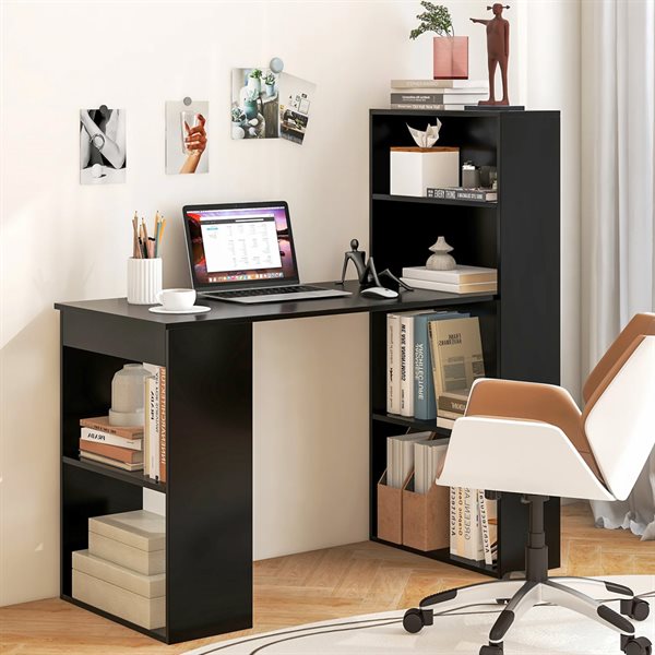 Skrivebord med Bokhylle – Svart Arbeidsbord med Fleksibel Oppbevaring