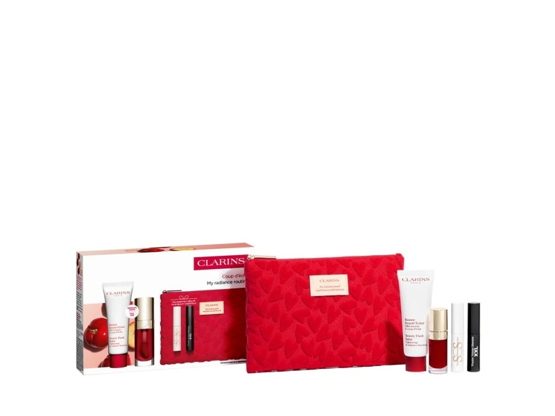Set Clarins: Beauty Flash, Revitalising, Balm, Face, 15 Ml + S.O.S., Eyelash Serum, 3 Ml + Lip Comfort, Hydrating, Lip Oil, 7 Ml + Wonder Volume, Volumising, Mascara, Black, 3 Ml *Miniature + Clarins, Gwp Textile Pouch, Red
