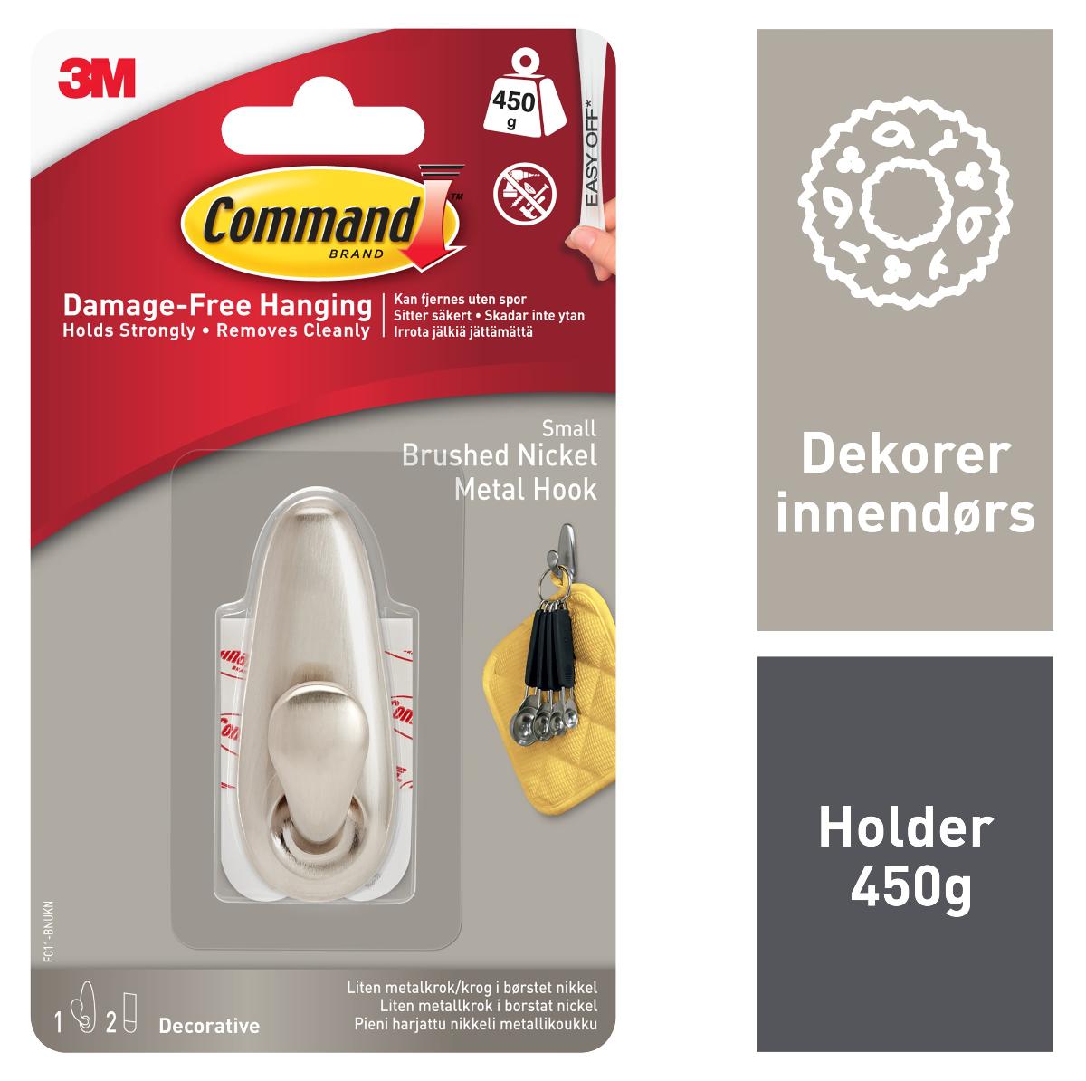 Command™ Liten krok i børstet nikkel, 17033, 1 krok, 2 strips