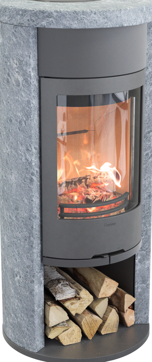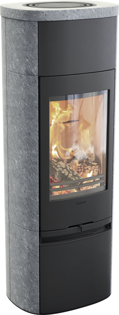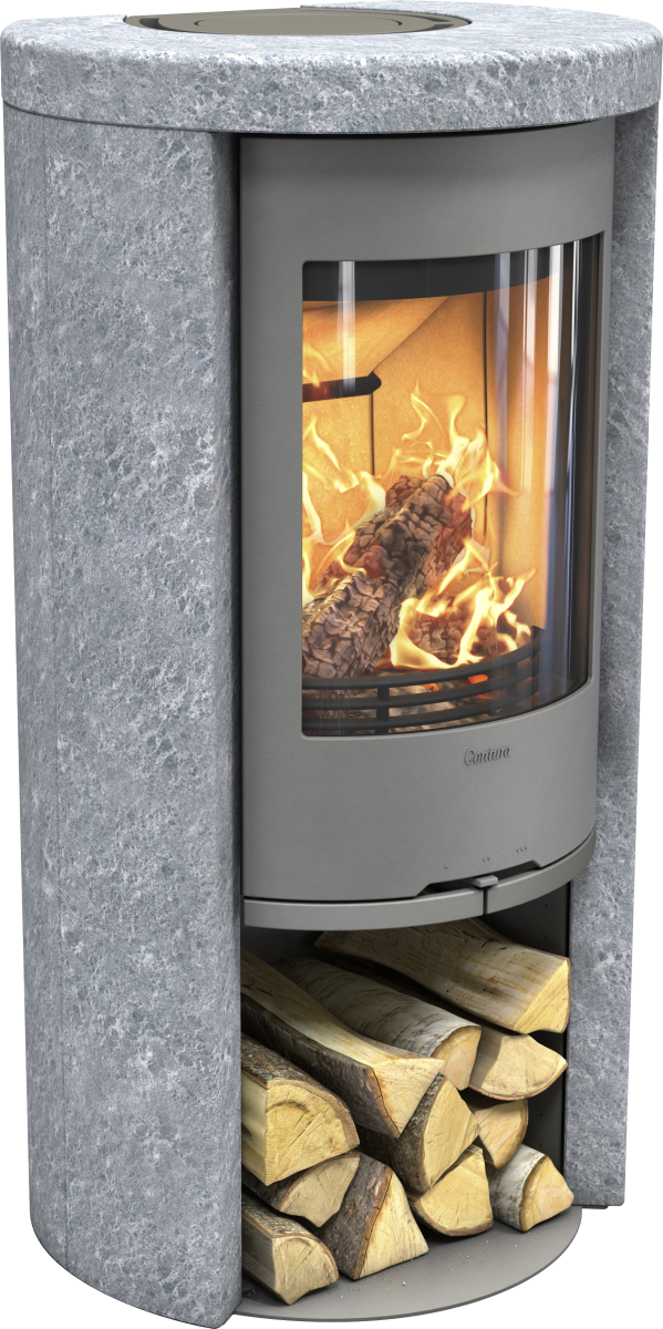 320TG grå vedovn med glassdør og kleberstensomramming