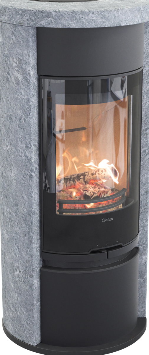 556T svart vedovn med sideglass, støpejernsdør og klebersteinsomramming