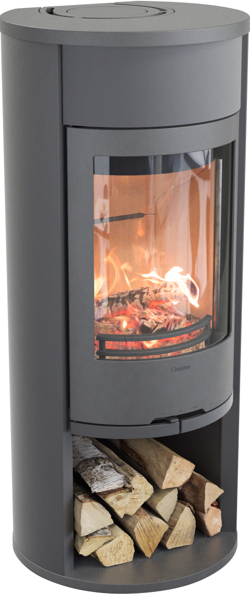 586 Style grå vedovn på pidestall med sideglass og støpejernsdør