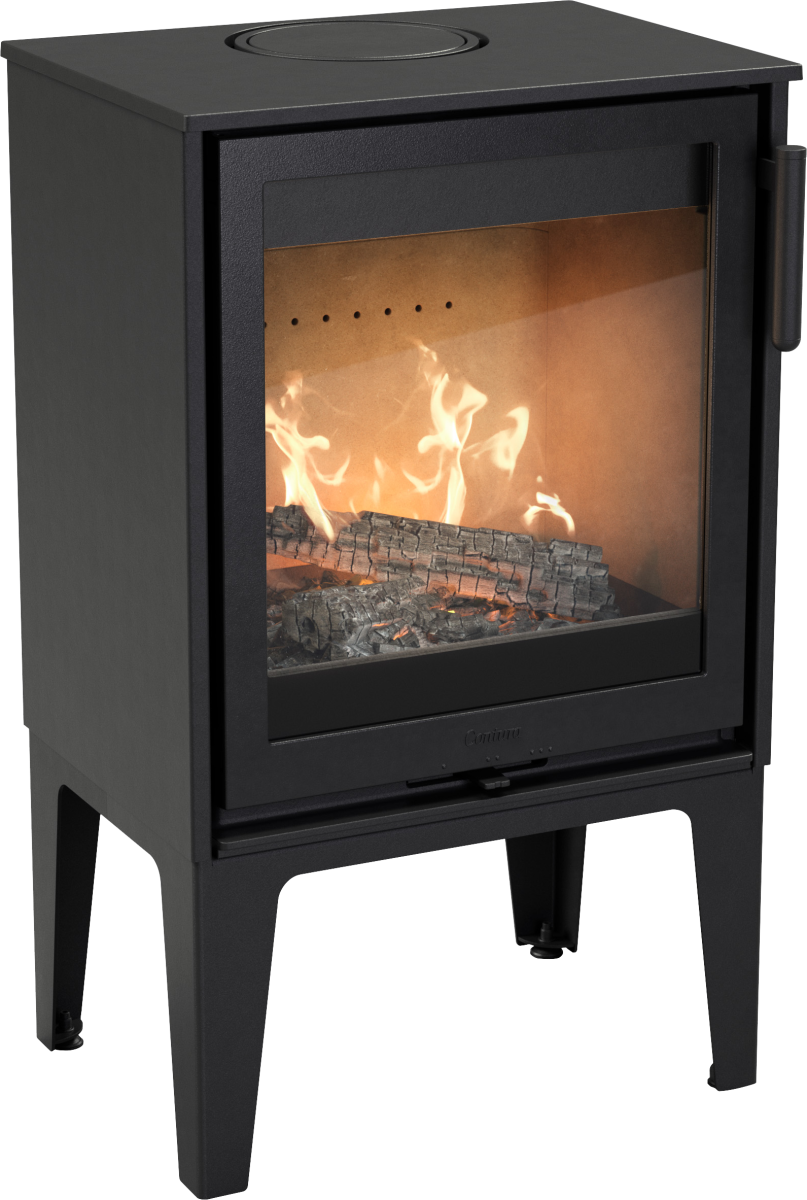 C210 svart vedovn med høye moderne ben og glassdør