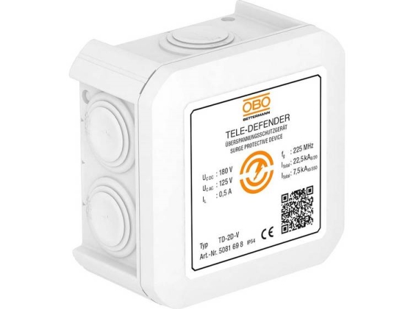 Obo Bettermann Td-2D-V. Ac-Pluggtyper: Terminal, Nominell Inngangsspenning: 125 V, Nominell Strømutgang: 0,5 A. Produktfarge: Hvit, Materiale: Plast, Overspenningsvernfunksjoner: Modem, Nettverk. Vekt: 95G, Bredde: 90Mm, Dybde: 53,7Mm. Sertifisering