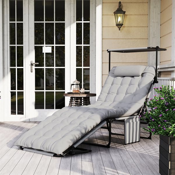 Solseng - justerbar dekkstol / lysegrå solstol / hageseng med soltak for hage, strand og basseng