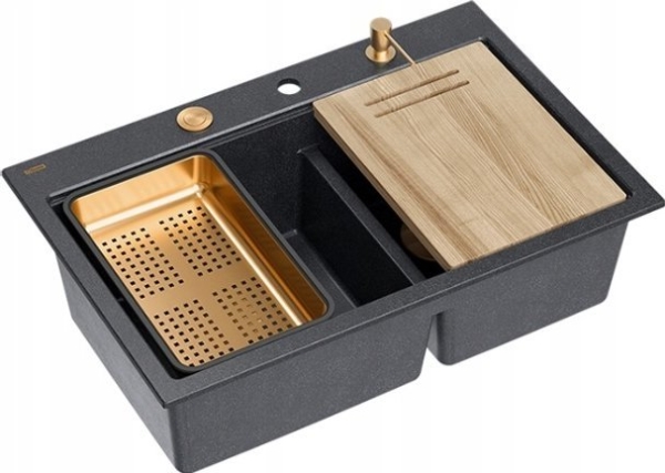 Graniteq Marc 120 Workstation Vask Graniteq 2-Skål Vask 760*500*235 Mm Svart Diamant + Trykk For Å Åpne Sifon + Dispenser + Brett + Innsats / Gullelementer