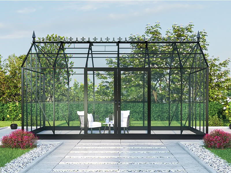 Orangeri, drivhus in glas 16,5m², 4,45x3,71x3,16mm/sokkel og takdekor, Svart