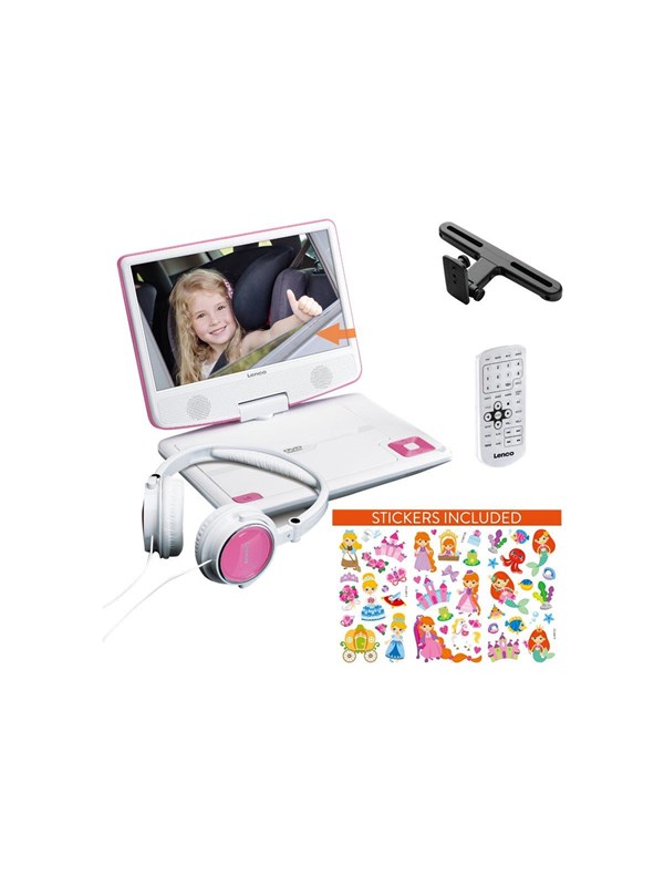 Lenco DVP-920PK - Portable 9" DVD player with USB headphones and mounting bracket - Pink/White