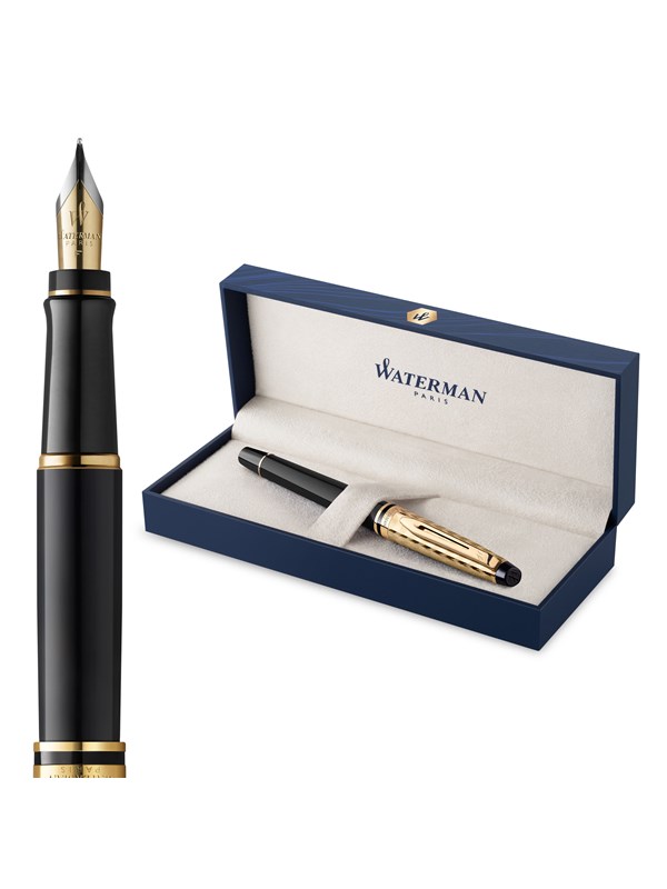 WATERMAN Expert Fountain Pen Black/Gold Barrel Blue Ink Gift Box - S0951660