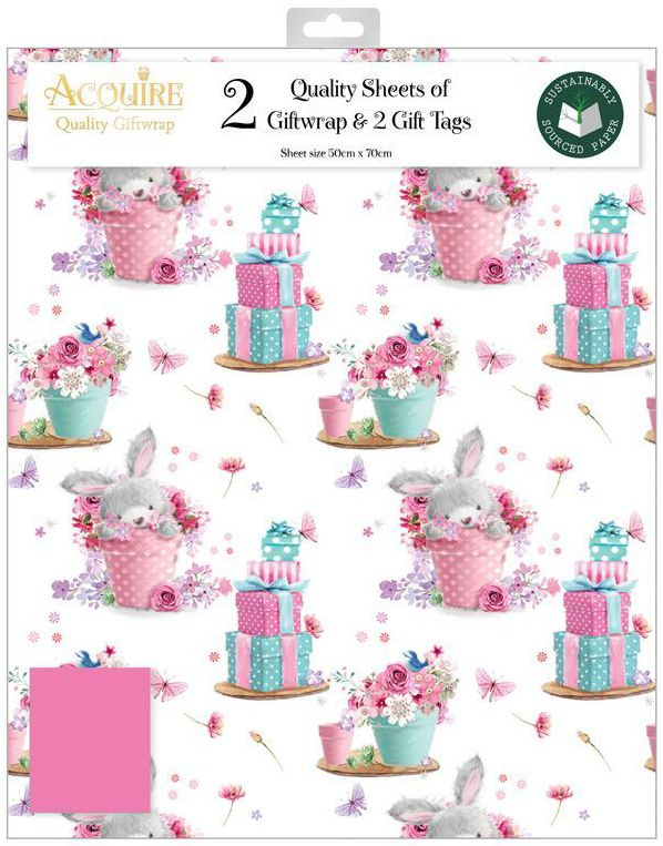 2 stk Rosa Søt Kanin Gavepapir med 2 stk Navnelapper - 50x70cm