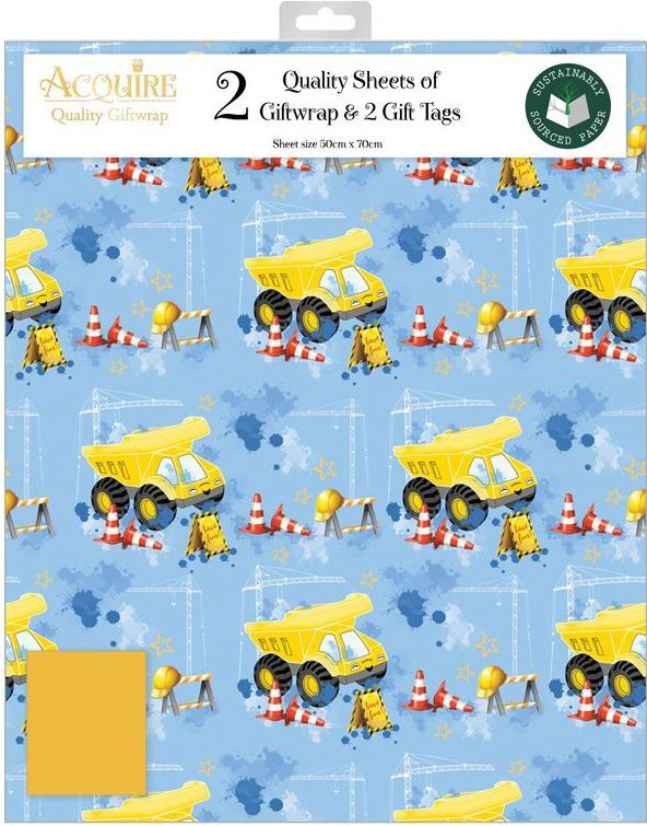 2 stk Blå Byggeplass Gavepapir med 2 stk Navnelapper - 50x70cm