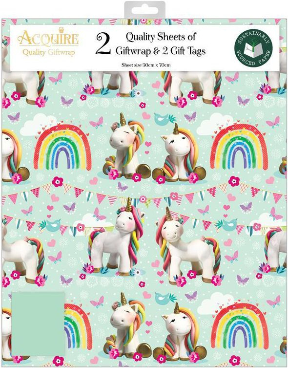 2 stk Enhjørning Regnbue Gavepapir med 2 stk Navnelapper - 50x70cm