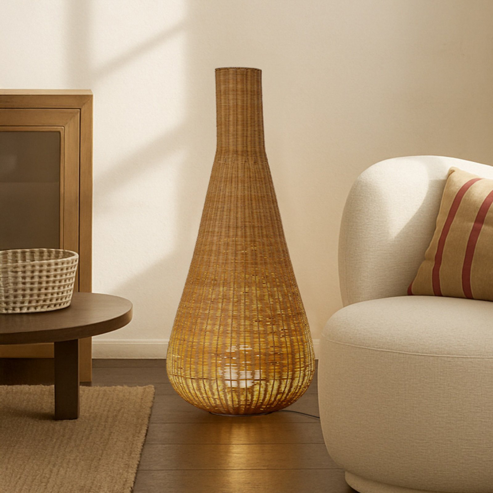 Lucande utendørs gulvlampe Taniola, beige, rotting, 195 cm, IP44 Taniola, Lyst tre , Tre, Herregård / rustikk, Gulvlampe lysstråle ned