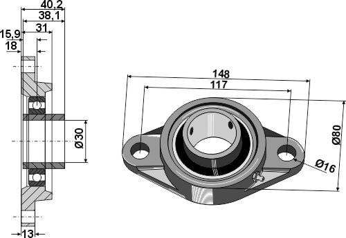 Spennlager UCFL til Tehnos Ø35, lengde 161 mm, hulrom 16 mm