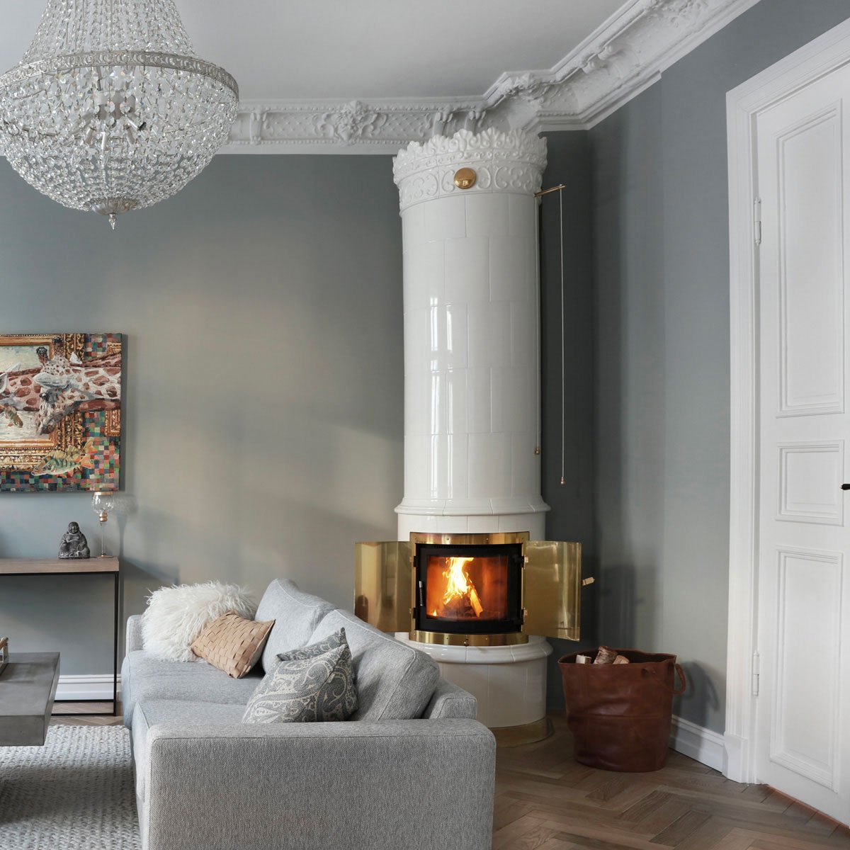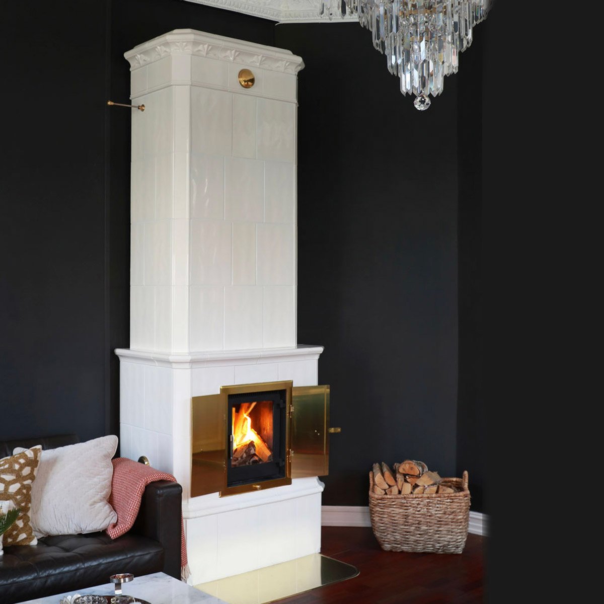 Skandinavian Classik hvit kakkelovn med krone og glassdør