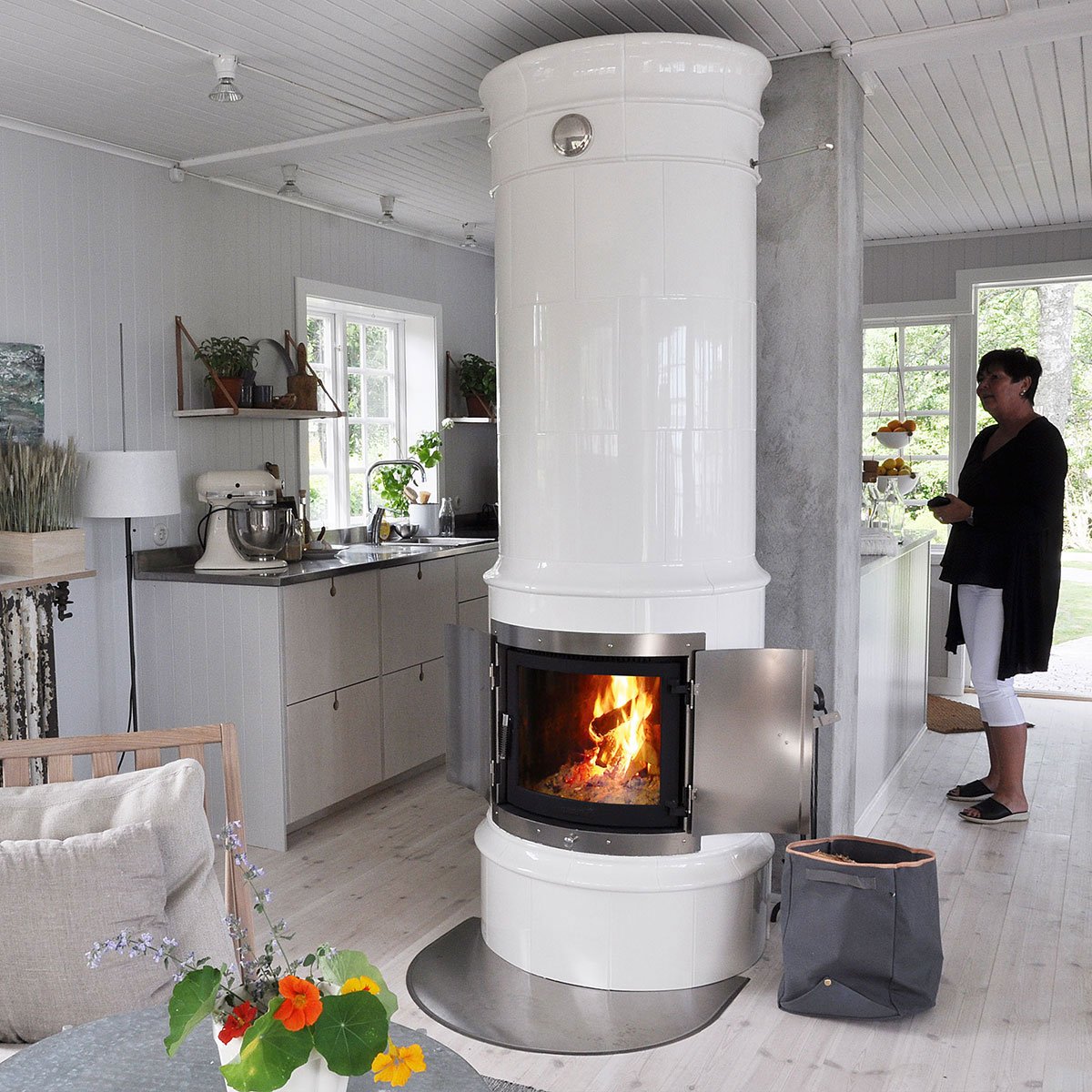 Kungsholm hvit rund kakkelovn med glassdør