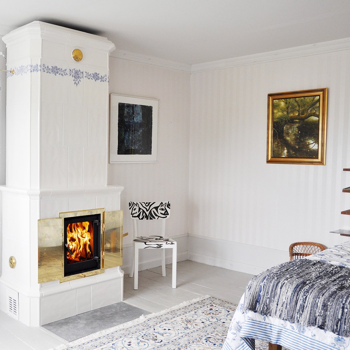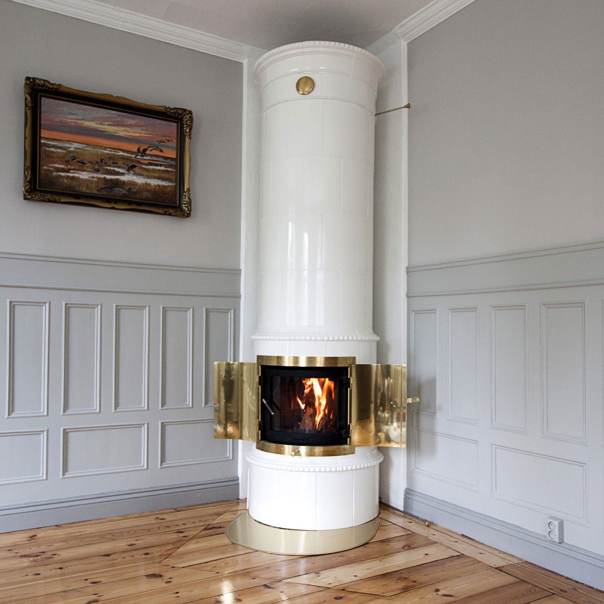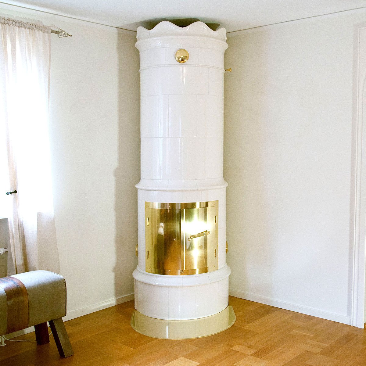 Duvemåla hvit rund kakkelovn med glassdør
