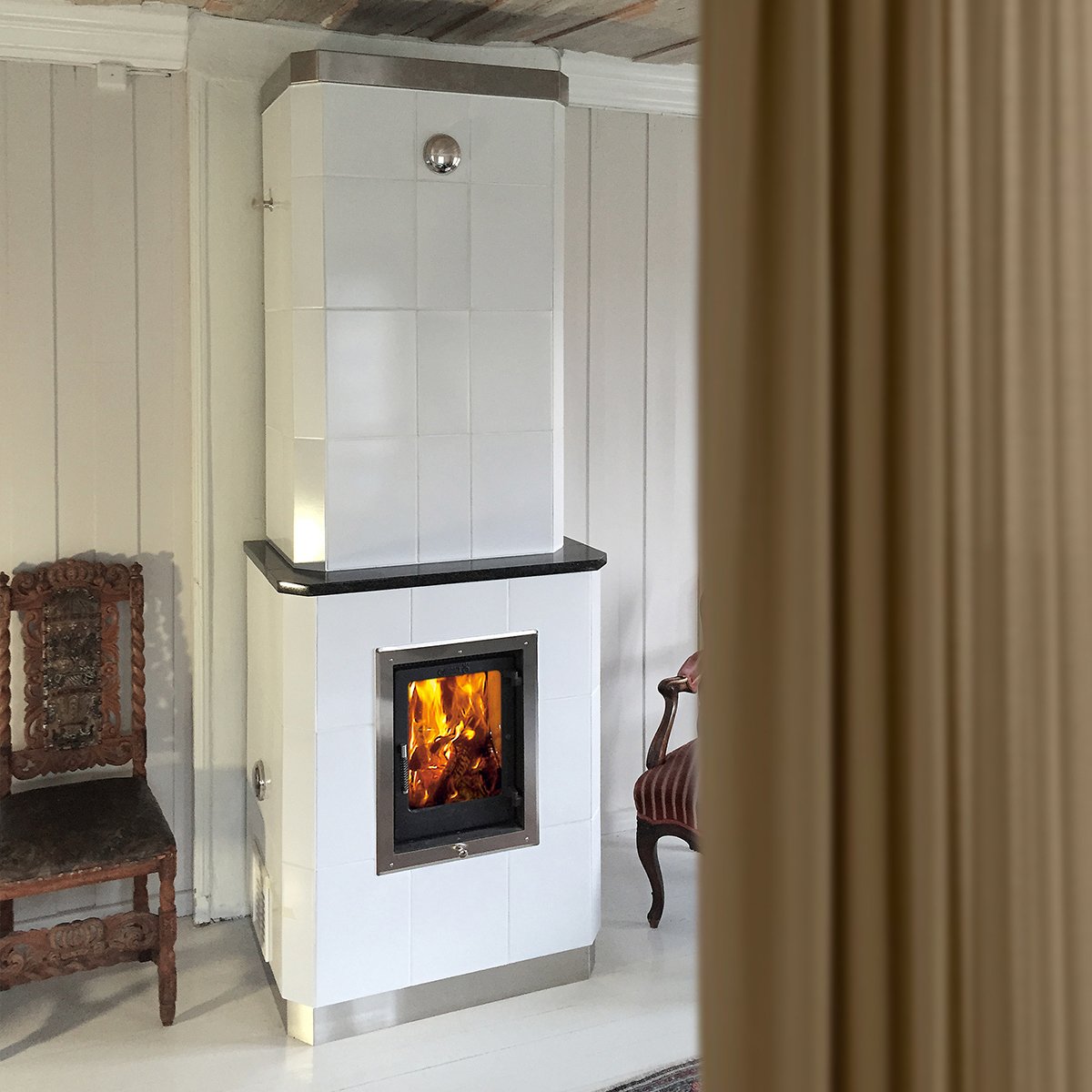 Skandinavian Classik hvit kakkelovn med sidehengslet glassdør