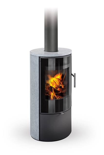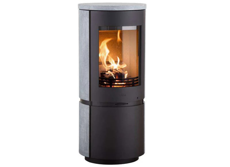 TT21RS Matt - svart vedovn med støpejernsdør og kappe av lys kleberstein
