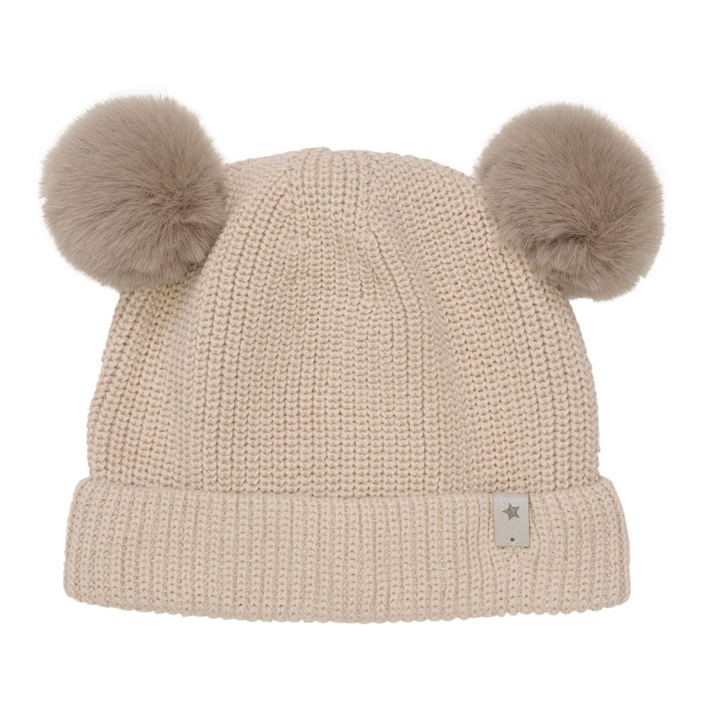 HUTTEliHUT hat knit fakefur pom's cotton - light camel - 2-4år