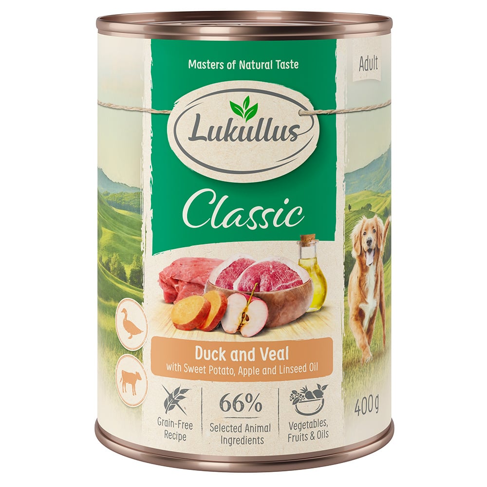 Lukullus Naturkost Adult Kornfri 6 x 400 g - And og kalv med søtpoteter, epler og linolje