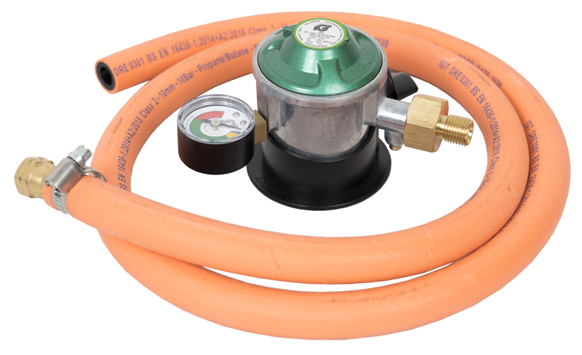 Gassregulator med slange, slangeklemmer og manometer