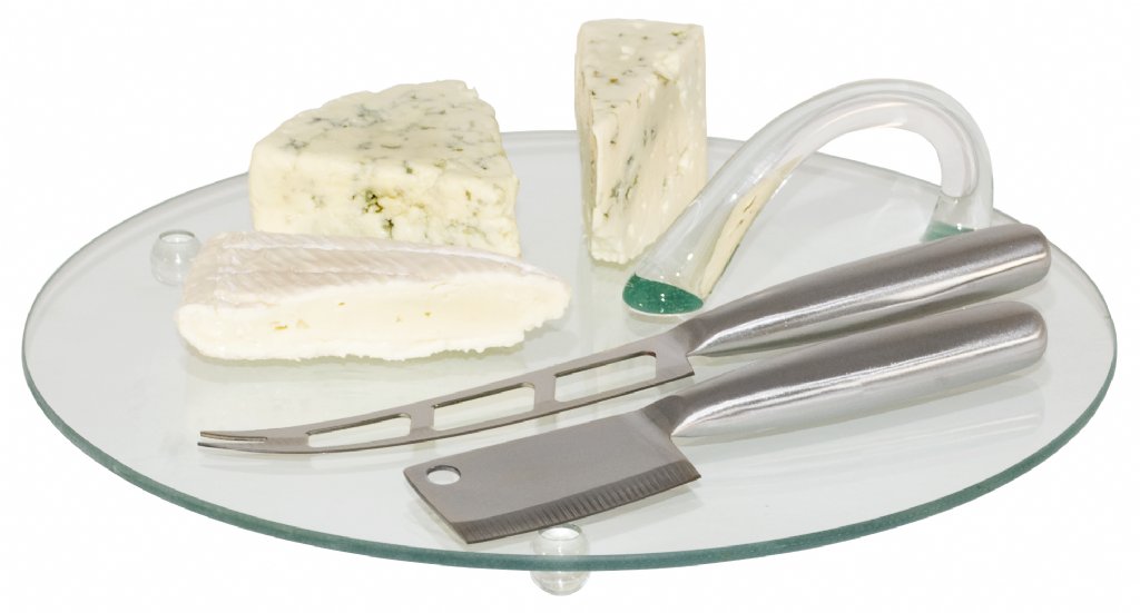 Ostbricka i glas med ostkniv och ostyxa