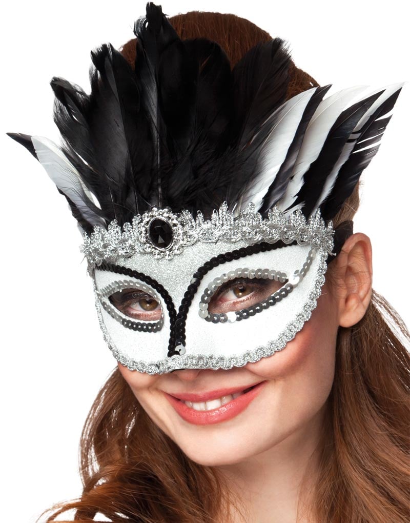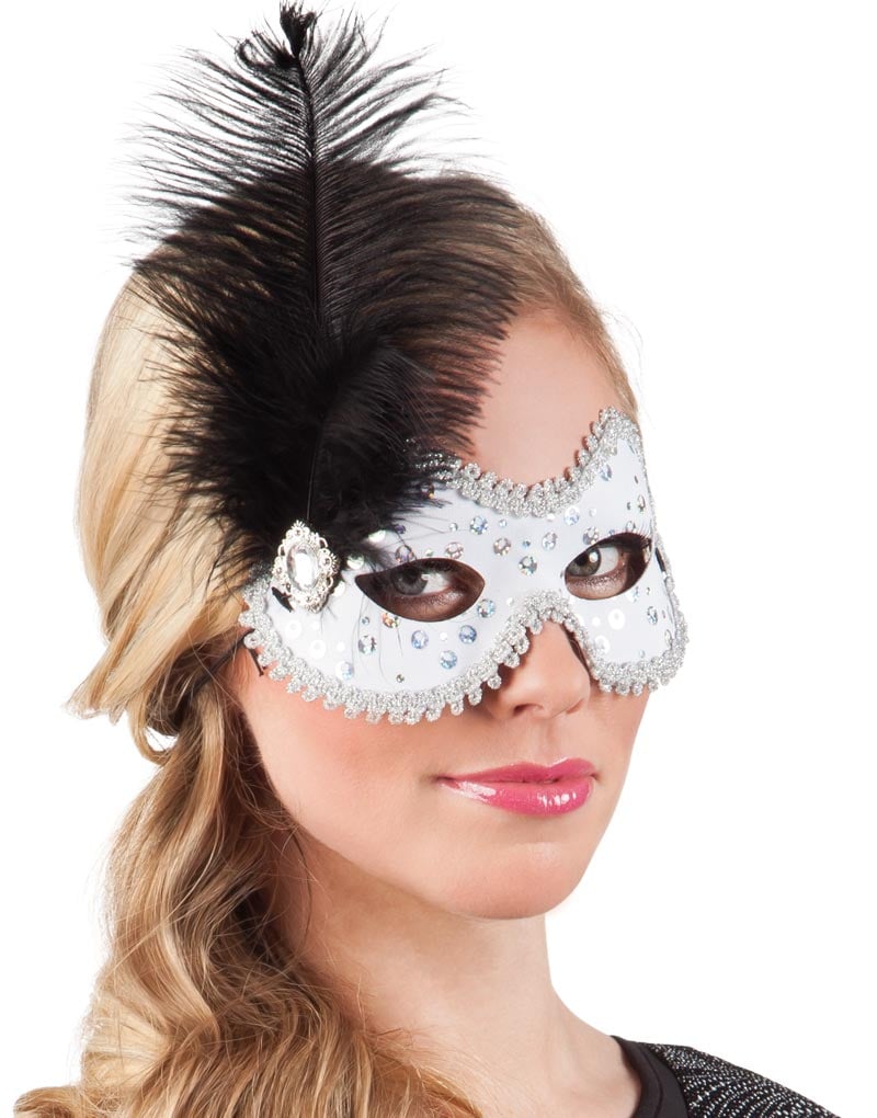 Hvit Øyemaske Med Svart Fjær og Sølvfarget Pynt