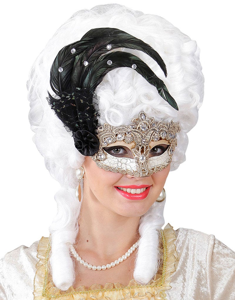 Hvit Venetiansk Øyemaske Med Svarte og Hvite Fjær