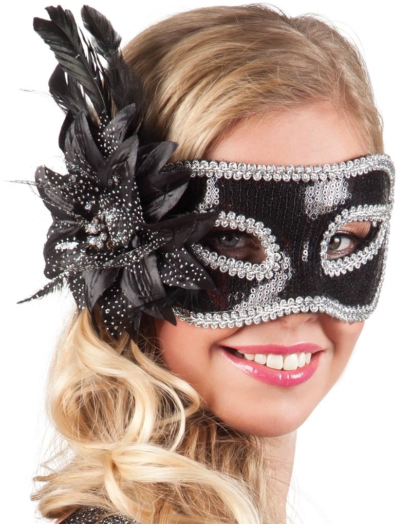 Svart Øyemaske med Blomst, Perler og Fjær