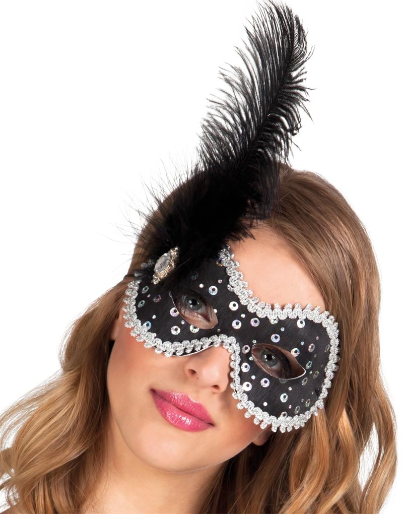 Svart Øyemaske Med Svart Fjær og Sølvfarget Pynt