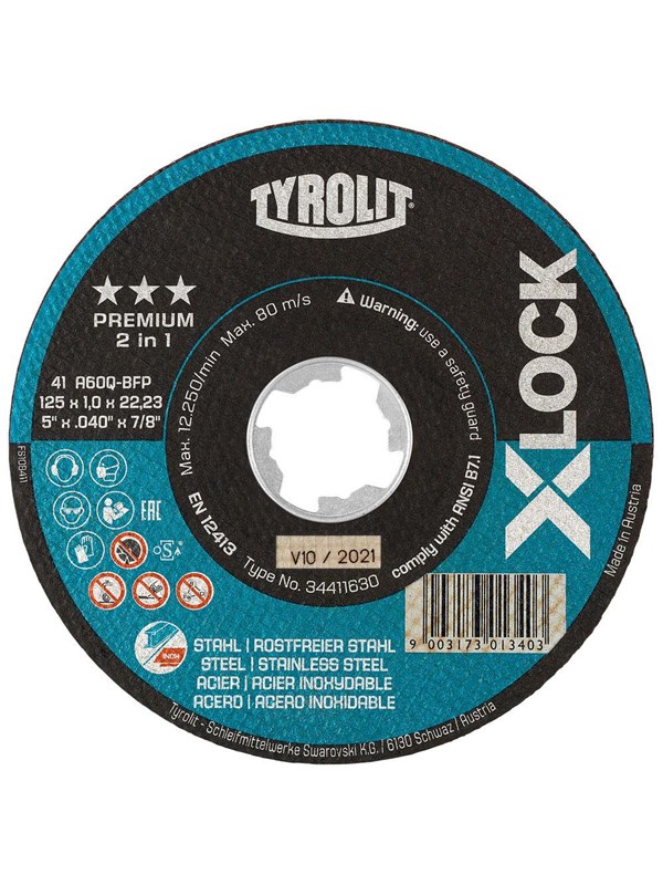 Tyrolit Xlock cut-off wheel 125x1x22.23/xl a60q-bfp- steel and inox