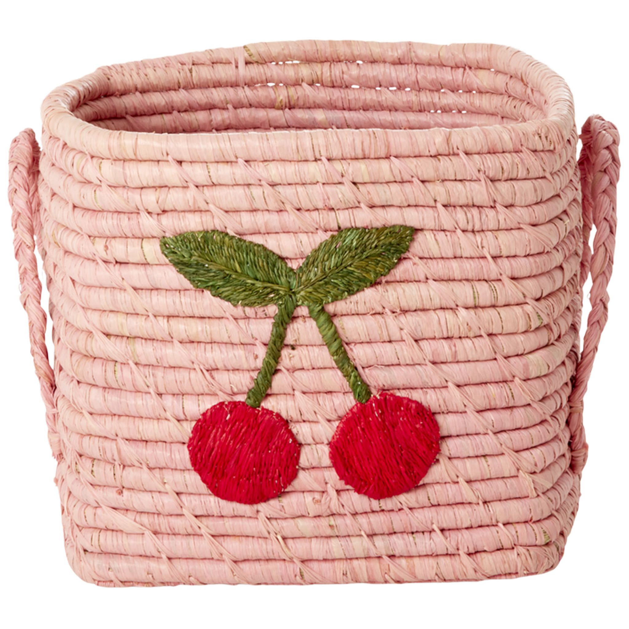 Rice - Raffia Square Basket with Big Cherry Embroidery - Soft Pink - Small