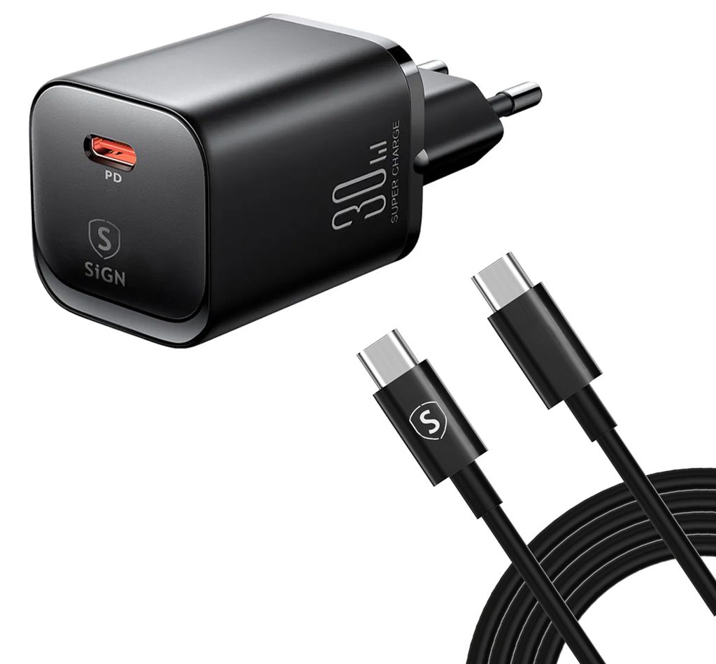 SiGN Hurtiglader USB-C 20W for Samsung S20-s23-serien 20W USB-C + Kabel 2m - Svart
