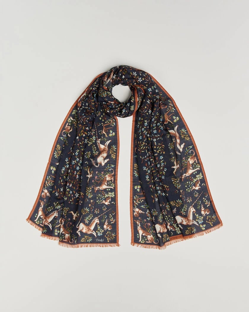 Drake's Unicorn Garden Wool/Silk Print Scarf Navy