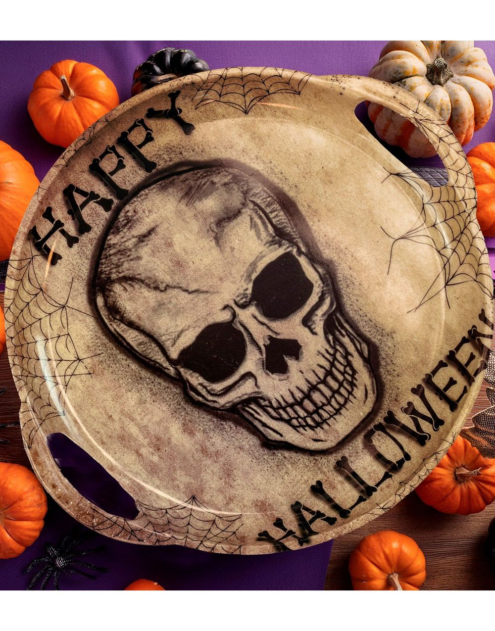 "Happy Halloween" Serveringsfat i Hardplast med Hodeskalle og Spindelvev - 30x33 cm