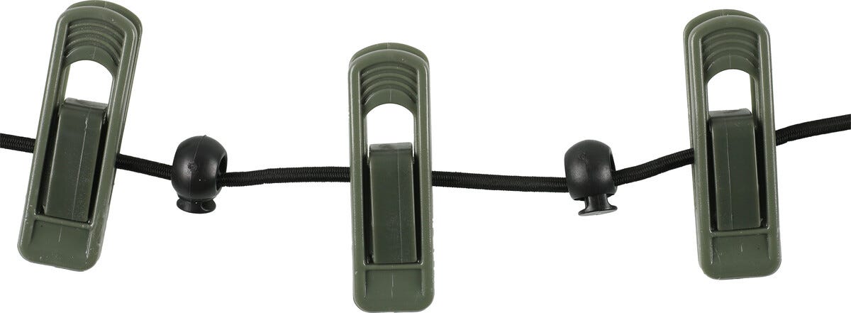 Tørkesnor camping, med 12 klesklyper og karabinkrok