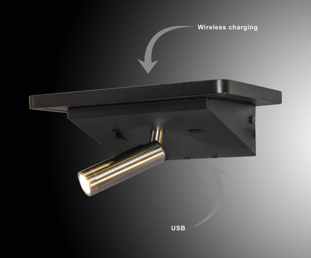 Vegglampe / nattlys med trådløs lader for smarttelefon + USB-kontakt