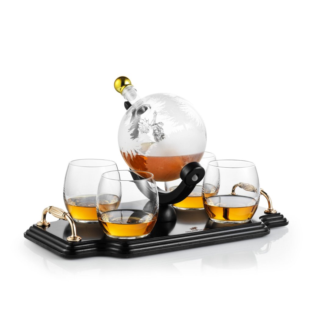Whiskeykaraffel Globe 85 cl med 4 glass og treplate