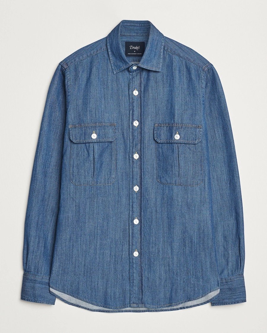 Drake's Denim Cotton Two Pocket Work Shirt Blue