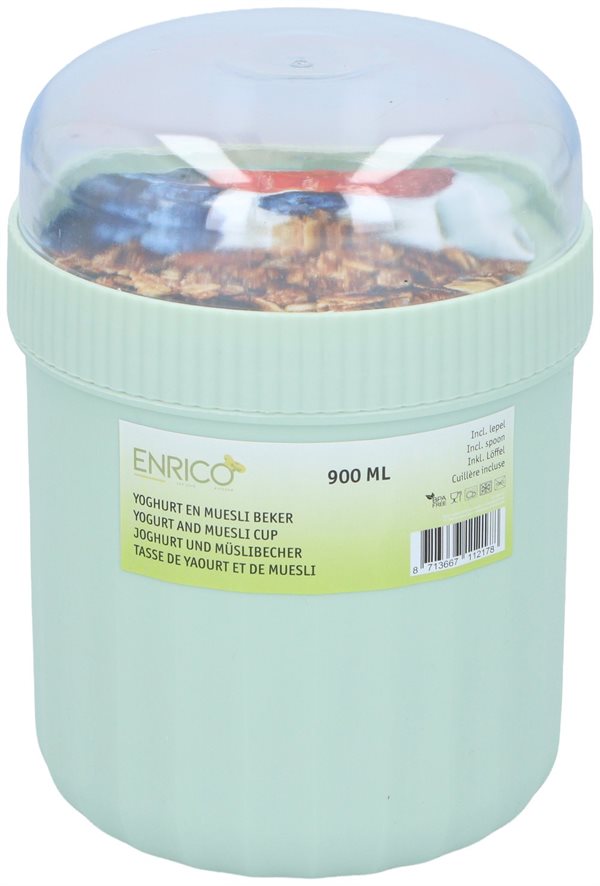 Yoghurt- og müslibeger 900 ml / yoghurtbeger med müslilokk / frokostbeger med skje / beger til yoghurt og granola