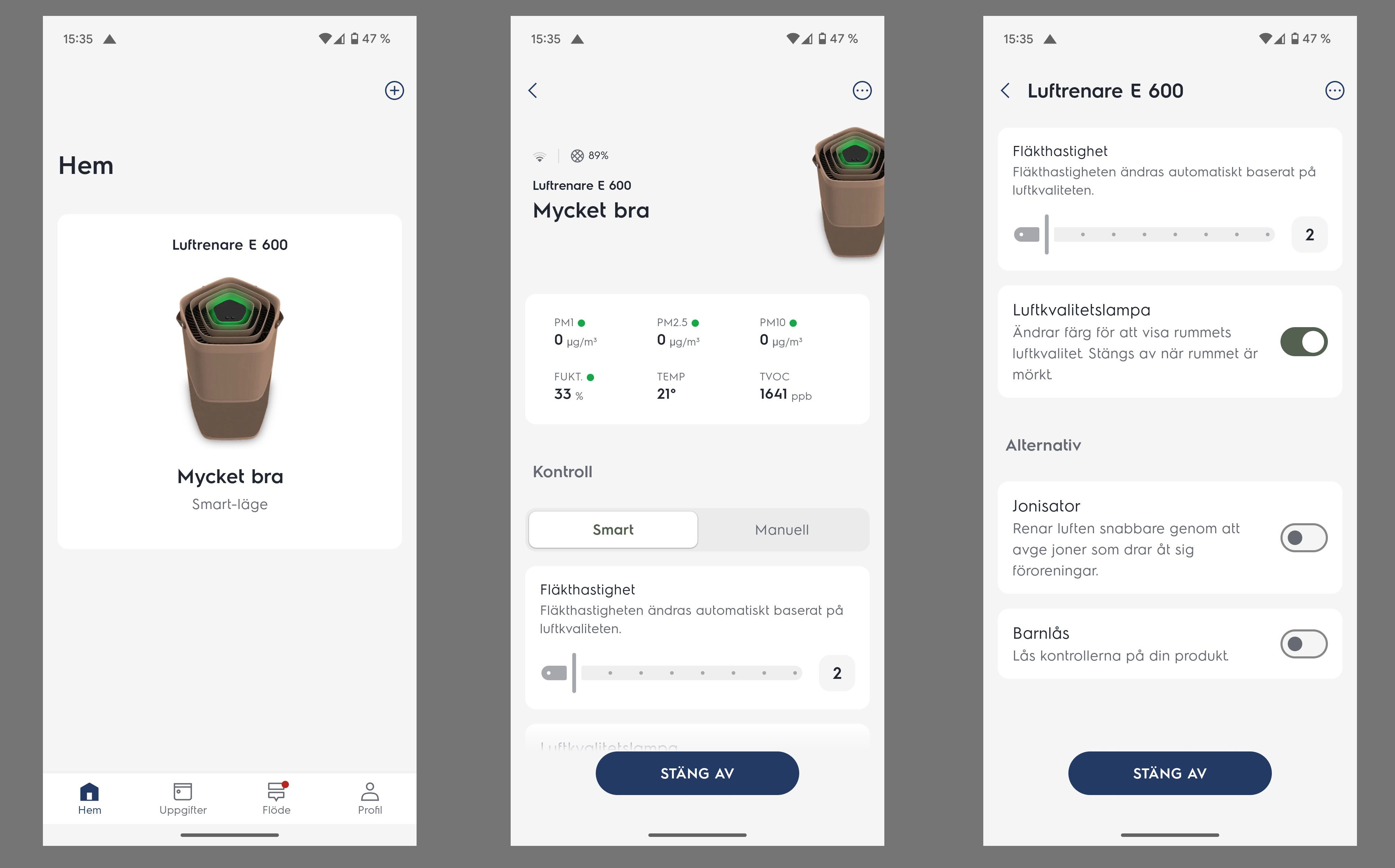 Jeg laster ned appen, og hele installasjonen går sømløst, helt til jeg skal koble luftrenseren til hjemmenettverket. Den vil bare ikke. Jeg prøver igjen og igjen… og igjen. Til slutt gir jeg opp. Men på et eller annet mystisk vis har den likevel koblet seg til, selv om appen sa noe annet. Vel, heller så enn motsatt!