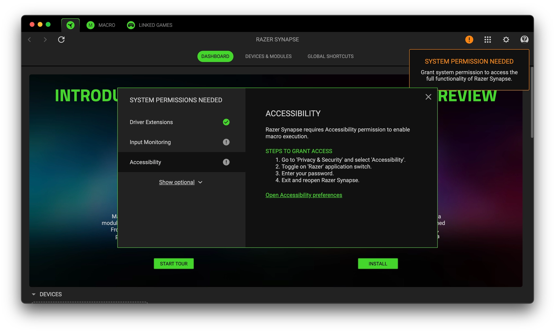Appen krever installasjon på Windows eller macOS og kjører alltid i bakgrunnen. DeathAdder V4 Pro støttes foreløpig ikke av Razer Synapse Web, nettleserversjonen som Viper V4 Pro allerede bruker. På macOS må flere systemtillatelser gis manuelt før musa dukker opp i det hele tatt. Dette er irriterende, men jeg ser for meg at dette er innstillinger man setter en gang, for deretter å la de være.