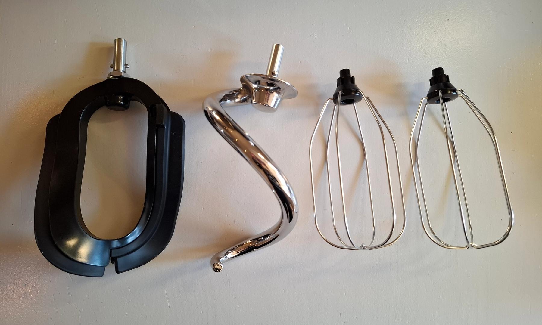 Av utstyr kommer maskinen med eltekrok, doble ballongvisper, flexivisp, deigskrape og sprutdeksel. Eltekroken er av rustfritt stål og er dermed skikkelig tung og solid. Flexivispen av plast og silikon passer supert til å for eksempel lage glasurer, kakedeiger eller potetmos. De doble vispene gjør det enkelt å piske krem og eggehviter luftig. Alt utstyret festes enkelt til maskinen og løsnes like lett, i motsetning til noen kjøkkenmaskiner hvor dette kan være en skikkelig IQ-test. Alt utstyret kan i tillegg vaskes i oppvaskmaskin.